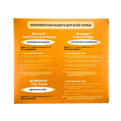 BiorepairKids – единственная зубная паста, содержащая частицы microRepair, которые укрепляют эмаль молочных зубов, способствуя правильному развитию и здоровью постоянных зубов. Ее эффективность клинически-протестирована. Исключительно деликатная формула BiorepairKids содержит экстракт персика, который освежает и питает десны.