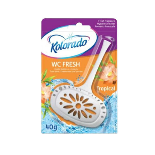 Брусок туалетный Kolorado WC Fresh Тропический 40 г — простое недорогое средство для поддержания идеальной чистоты в туалете. Насыщенный тропический аромат перекрывает неприятные запахи, а активная пена не только уничтожает бактерии и микробы, но и предотвращает образование известнякового налета и каменных отложений.
