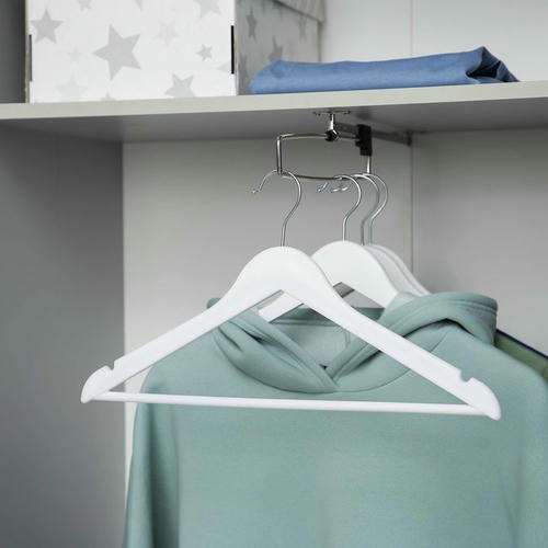 Вешалка – это компактное приспособление, которое позволит вам разместить в гардеробе классические штаны из лёгких или плотных материалов, блузки, рубашки, кофты и другие вещи. Изделие практичной формы занимает мало места, что позволяет экономить пространство в шкафу. Эргономичная форма поможет надёжно зафиксировать одежду и предотвратить её падение.
