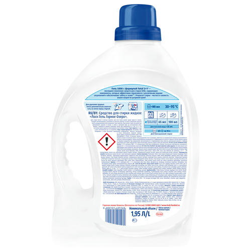 - Как правильно стирать: используя колпачок, налейте средство в отсек для стиральных порошков согласно рекомендуемой дозировке. Предварительная обработка пятен: для удаления трудных пятен дополнительно нанесите гель на пятно перед стиркой. Для стирки белых и светлых изделий их хлопчатобумажных, льняных, синтетических тканей и тканей из смешанных волокон (кроме шерсти и шелка) в стиральных машинах-автоматах и ручной стирки в воде любой жесткости. При выборе режима стирки и температуры следуйте рекомендациям, указанным на ярлыках одежды и в паспорте стиральной машины. Белое белье стирайте отдельно от цветного. При ручной стирке несколько раз прополощите изделие в теплой, а затем в холодной воде до исчезновения пены. Перед использованием рекомендуется взбалтывать.