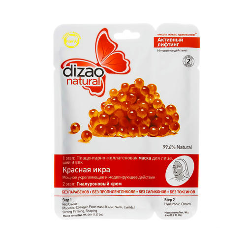 1 этап: Плацентарно-коллагеновая маска для лица и шеи. Мощное укрепляющее и моделирующее действие Как действует маска? моделирует овал лица разглаживает морщины увлажняет насыщает кожу витаминами и минералами блокирует действие свободных радикалов В результате применения маски: кожа выглядит подтянутой и помолодевшей. 2 этап: гиалуроновый крем Действие гиалуронового крема: интенсивно увлажняют и повышают упругость кожи. Рекомендация по применению: после применения маски нанести гиалуроновый крем тонким слоем и дать полностью впитаться. Преимущества масок для лица Dizao: 99,6% натуральных ингредиентов Содержит растительный коллаген и растительную гиалуроновую кислоту СПА-эффект: восстановление, моделирование лица Экспресс-лифтинг Не содержит парабенов, ГМО, продуктов нефтехимии Экологичная удобная упаковка