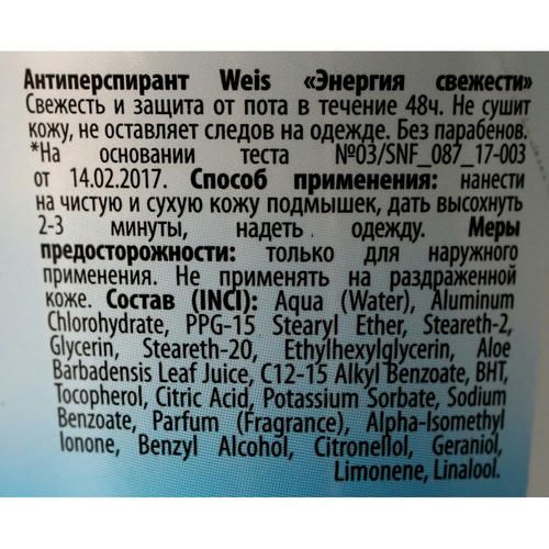 Свежесть и защита от пота в течение 48ч. Не сушит кожу, не оставляет белых пятен на одежде. Без парабенов. Одобрено дерматологами на основании теста №03/SNF_087_17-003 от 14.02.2017.