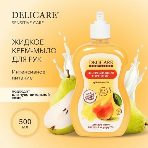 Жидкое крем-мыло Delicare “Интенсивное питание” нежно очищает, интенсивно питает и смягчает кожу рук, активно ухаживая за ней. Экстракт груши, входящий в состав мыла, обогащенный необходимыми витаминами A, B1, B2, C, E, P, PP и органическими кислотами, делает кожу более гладкой и здоровой. Подходит для чувствительной кожи.