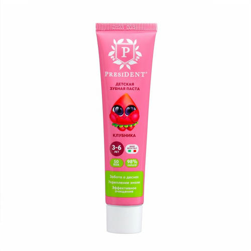 Зубная паста детская President “Клубника” предназначена для детей в возрасте от 3 до 6 лет. Она имеет приятный вкус клубники, что может сделать процесс чистки зубов более привлекательным для детей этой возрастной группы.