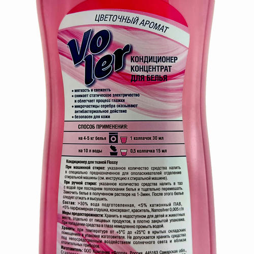 Способ применения: При стирке в машине-автомат на 4-5 кг белья, заливают один колпачок кондиционера. При ручной стирке на 10 литров воды заливают 0,5 колпачка кондиционера. Объем колпачка 30 мл