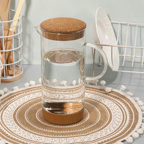 Кувшин, O`Kitchen, из прозрачного стекла с деревянными элементами отлично подойдёт для сервировки холодных и горячих напитков. Дополнен горлышком для удобного наливания и большой ручкой. Выдерживает температуру от -20 °С до +150 °С. Объём: 1,2 л. Размер: 9,8х23 см. Состав: боросиликатное стекло, пробка. Не мыть в посудомоечной машине