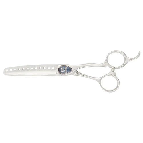Эти ножницы можно использовать в качестве обычных ножниц для стрижки волос. Прямой срез, врезание вертикально вставленными ножницами в пучок волос, работа ножницами над расческой. Легко сделать мягкую отделку любых причесок. 12 зубьев Т-образной формы без насечки. Срезают около 80% сухих волос.