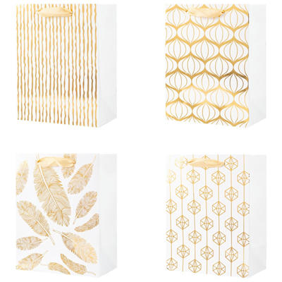 Белые подарочные пакеты с золотым фольгированным узором. В блоке 4 дизайна. Плотность 210 г/м2. Размер пакета 18х23х12см.