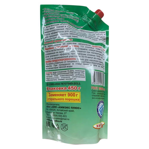 Способ применения: В зависимости от загрязнения поместите в барабан стиральной машины 1-3 столовых ложки (50-100г) на 10л воды (6кг белья). Стирайте, следуя рекомендациям, указанным на ярлыке ваших изделий. Для усиления эффекта, при удалении сложных пятен, нанесите пасту на загрязненный участок за 10-15 минут до стирки