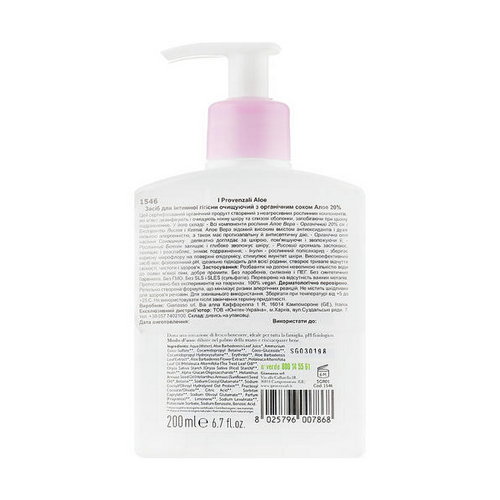 Средство для интимной гигиены очищающее с органическим соком алоэ 20% – I Provenzali Aloe Organic Intimate Wash обеспечивает максимально деликатный уход. Формула состоит из органических растительных ингредиентов: масла семян подсолнуха, экстрактов и сока из листьев и цветов алоэ вера, рисового крахмала, растительного бетаина, инулина. Все компоненты состава – неагрессивные, мягко воздействуют на нежную кожу, не провоцируют сухости или раздражений. Чистота, комфорт и свежесть – ощущения после применения представленного продукта.