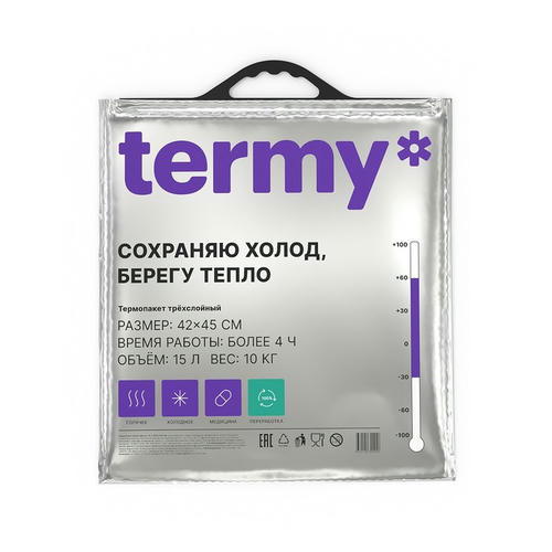 Termy сохраняет температуру более 4 часов, он вместительный и его легко мыть. Термопакет для продуктов это хорошая альтернатива громоздким приспособлениям как термосумка, термоконтейнер, термобокс, ланч бокс, термокороб, переносной холодильник.