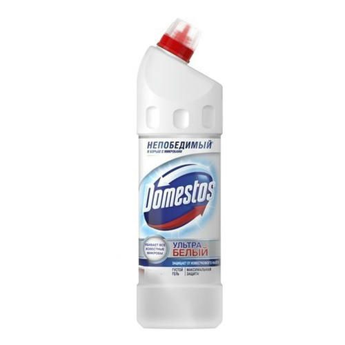 Domestos – признанный эксперт’ в заботе о чистоте туалета и ванной комнаты. Чистящее средство для унитаза Domestos Ультра белый поможет легко и быстро привести в порядок ваш туалет и уничтожить микробы для защиты всей вашей семьи. Инновационный изогнутый дозатор обеспечивает максимальную зону поражения микробов благодаря носику, который до 3 раз эффективнее” в труднодоступных местах и под ободком унитаза.Благодаря особой густой формуле с дезинфицирующим эффектом и чистящими компонентами Domestos Ультра белый не только очищает, но и превосходно отбеливает фаянсовые поверхности. Ваша сантехника засияет белоснежной чистотой. Кроме того, Domestos Ультра Белый экономичен – благодаря густой гелевой текстуре он расходуется намного дольше, чем обычные жидкие средства. Ультра белый многофункционален: он подходит не только для чистоты и гигиены унитаза, но и для удаления плесени, мыльного осадка, антимикробной обработки малых поверхностей и предотвращения известкового налета.Domestos Ультра Белый гель обеспечивает эффективное очищение, уничтожение всех известных микробов (включая бактерии, грибок и вирусы)”’, обеспечивая настоящую гигиену дома и, как результат, способствует предотвращению распространение различных вирусных и бактериальных инфекций. Перед применением прочтите инструкцию и соблюдайте осторожность при использовании средства. Регулярно используйте средство Domestos для поддержания чистоты и защиты вашего дома.’ В линейке Unilever.” Согласно результатам инструментальных тестов Unilever (Турция, 2014).”’ Эффективность очищения и антимикробное действие (против бактерий, грибка, плесени, спор и вирусов – норовирус тип 1, аденовирус тип 5, мышиный норовирус) подтверждены инструментальными тестами Unilever (Италия, 2016).
