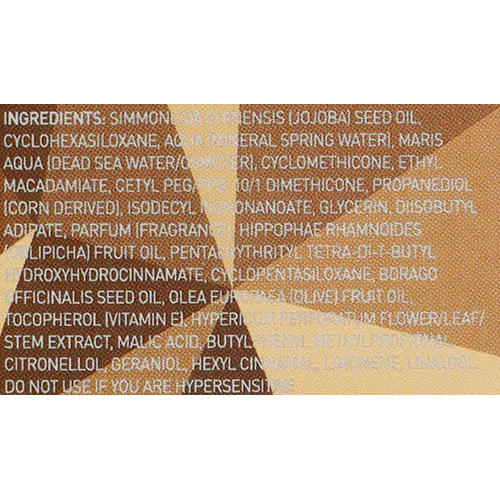 Simmondsia Chinensis (Jojoba) Seed Oil, Cyclohexasiloxane Aqua (Mineral Spring Water), Maris Aqua (Dead Sea Water), Cyclomethicone, Ethyl Macadamiate, Cetyl PEG/PPG-10/1 Dimethicone, Propanediol (Corn Derived Glycol), Isodecyl Isononanoate, Glycerin, Diisobutyl Adipate, Parfum (Fragrance), Hippophae Rhamnoides (Oblipicha) Fruit Oil, Pentaerythrityl Tetra-DI-T-Butyl Hydroxyhydrocinnamate, Cyclopentasiloxane, Borago Officinalis Seed Oil, Olea Europaea (Olive) Fruit Oil, Tocopherol (Vitamin E), Hypericum Perforatum Flower/Leaf/Stem Extract, Malic Acid, Butylphenyl Methylpropional, Citronellol, Geraniol, Hexyl Cinnamal, Limonene, Linalool