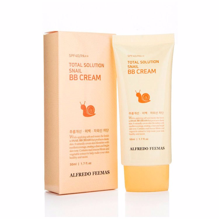 Alfredo Feemas Total Solution Snail B.B Cream Spf40/Pa++ – Это натуральное покрытие, которое не кажется душным, содержит фильтрат слизи улитки и растительные экстракты, которые увлажняют кожу и делают ее эластичной.