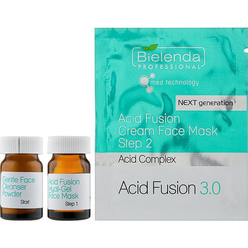 Состав набора: Маска для лица – Bielenda Professional Acid Fusion Hyal-Gel Face Mask Step 1, 5×10 г + Маска для лица – Bielenda Professional Acid Fusion Cream Face Mask Step 2, 5×20 г + Мягкая пудра для умывания – Bielenda Professional Acid Fusion 3.0 Gentle Face Cleanser Powder, 5×15 г