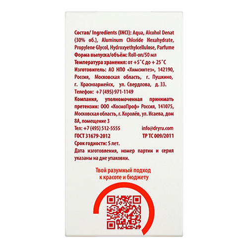 DRY RU (Драй Ру) – российский бренд, который был создан в 2015 году и принадлежит фармацевтической компании «Сканди Лайн». Под данной торговой маркой выпускается эффективная косметика в сегменте антиперспирантов. Вся продукция создается с учетом предпочтений потребителей и соответствует российским требованиям качества и производственным стандартам.