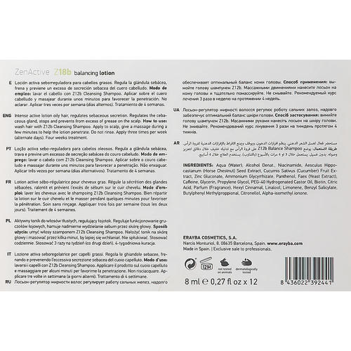 Лосьон в ампулах Erayba 18 b Balancing Lotion содержит уникальный экстракт огурца и комплекс SEBARYL. Регулирует секрецию сальных желез кожи головы благодаря входящим в его состав растительным, минеральным и биотехнологическим экстрактам. При нанесении на вымытые волосы данного лосьона в ампулах будет надолго обеспечен оптимальный баланс кожи головы, она обогатится всеми необходимыми компонентами. В результате волосы получат прекрасный уход, эффективное питание и увлажнение. Продукт обладает нежным легким успокаивающим ароматом алоэ вера. При использовании ампул 18b Balancing Lotion вы испытаете ощущение свежести и комфорта волос на долгое время. А если их использовать регулярно 3 раза в неделю – у вас навсегда исчезнет проблема эффекта жирных волос.