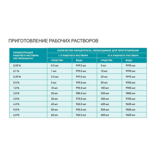 Режимы обработки: Для приготовления рабочих растворов необходимо иметь мерные ёмкости для дозирования концентрата. Вода, используемая для приготовления рабочих растворов, может быть как комнатной температуры (20±2_С), так и тёплой до 40-50_С