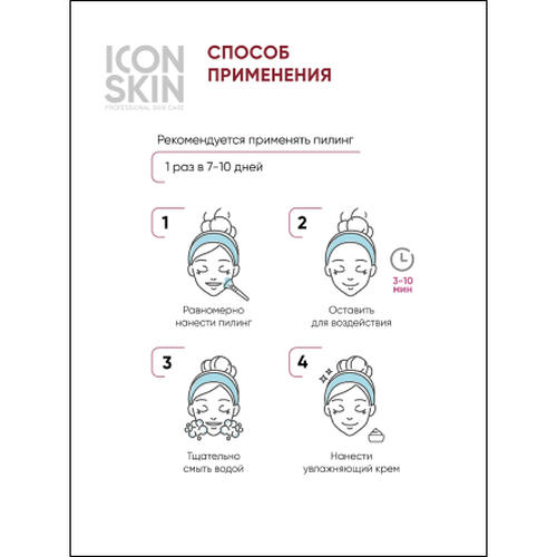 Способ применения: Нанести пилинг на сухую, очищенную кожу. Оставить на 5-15 минут (первое применение — 5 минут, с каждой последующей процедурой постепенно увеличивать время экспозиции). Тщательно смыть прохладной водой и просушить. Нанести крем, подходящий типу кожи. Применять пилинг 1 раз в 7-10 дней.