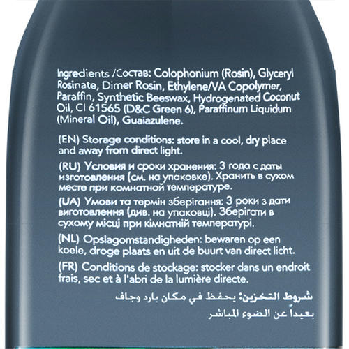 Состав: Rosin, Glyceryl Rosinate, Dimer Rosin, Ethylene, Paraffin, Synthetic Beeswax, Hydrogenated Coconut Oil, CI 61565 (D&C Green 6), Paraffinum Liquidum (Mineral Oil), Guaiazulene.