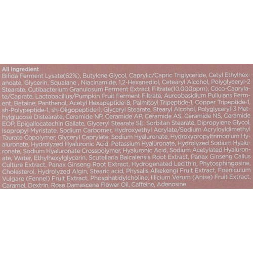 Bifida Ferment Lysate (62%), Butylene Glycol, Caprylic/Capric Tryglycerides, Cetyl Ethylhexanoate, Glycerin, Squalane, Niacinamide, 1,2-Hexanediol, Cetearyl Alcohol, Polyglyceryl-2 stearate, Cutibacterium granulosum fermentation extract filtrate (10000 ppm), Coco-caprylate/Caprate, Lactobacillus / Pumpkin fermentation filtrate, Aureobasidium Pullulans Ferment, Betaine, Panthenol, Acetyl Hexapeptide-8, Palmitoyl tripeptide-1, Copper tripeptide-1, SH-Polypeptide-1, SH-Oligopeptide-1, Glyceryl Stearate, Stearyl Alcohol, Polyglyceryl-3 Methylglucose Distearate, Ceramide 3, Ceramide 6, Ceramide 5, Ceramide 2, Ceramide 9, Epigallocatechin Gallate, Glyceryl Stearate SE, Sorbitan Stearate, Dipropylene glycol, Isopropyl myristate, Sodium carbomer, Hydroxyethyl acrylate / sodium acryloyl dimethyl taurate copolymer, Glyceryl caprylate, Sodium Hyaluronate, Hydroxypropyltrimonium hyaluronate, Hydrolyzed Hyaluronic Acid, Potassium hyaluronate, Sodium Hyaluronate, Sodium Hyaluronate Crosspolymer, Hyaluronic Acid, Sodium acetylhyaluronate, Aqua, Ethylhexylglycerin, Scutellaria Baicalensis Root Extract, Panax Ginseng Callus Culture Extract, Panax Ginseng Extract, Hydrogenated lecithin, Phytosphingosine, Cholesterol, Hydrolyzed Algin, Stearic Acid, Physalis Alkekengi Fruit Extract, Foeniculum Vulgare Fruit Extract, Phosphatidylcholine, Illicium Verum (Anise) Fruit Extract, Caramel, Dextrin, Rosa Damascena Flower Oil, Caffeine, Adenosine