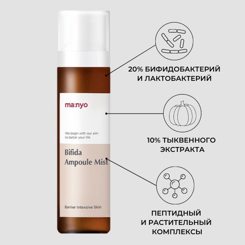 Это мощное многофункцональное средство в удобном формате спрея. В составе бифидо и лактобактерий (20%), фермент фильтрата тыквы (10%), ферментированный экстракт соевых бобов, которые поддерживают здоровье микробиоты, укрепляют защитные функции кожи, снимают покраснения и выравнивают общий тон кожи, придают ей красивое сияние.