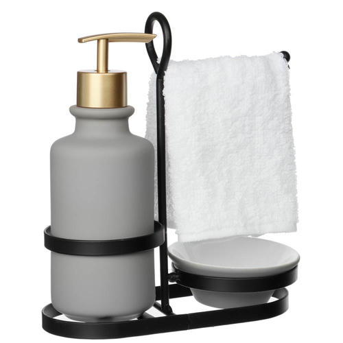 Диспенсер для моющего средства с салфеткой и металлической стойкой VETTA – это удобный набор для ванной комнаты, который имеет эстетичный дизайн, прекрасно дополняющий интерьер. Стойка не занимает много пространства, а также исключает случайное опрокидывание керамического диспенсера. Нажимной дозатор выдает оптимальное количество мыла, что значительно экономит расход моющего средства. Керамика обладает повышенной износостойкостью, легко моется и не теряет вид с течением времени.